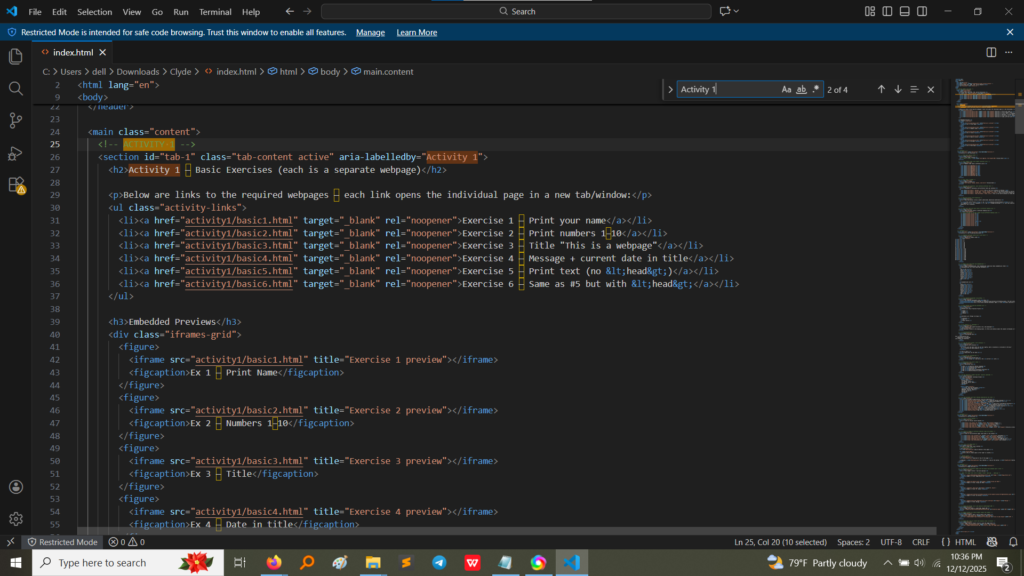 <ul> tag (which stands for Unordered List) to start the list and <li> (which stands for List Item) for each link.<a> tag (the Anchor tag, which makes links) and the href attribute to tell the browser where to go (e.g., activity1/basic1.html).target="_blank". This is what forces the link to open in a completely new browser tab, which is great for user experience!<iframe> tag. This is a special tag that essentially creates a little “window” inside your webpage and loads another entire webpage into it.This project was fundamental. Here are the three most important things I learned: