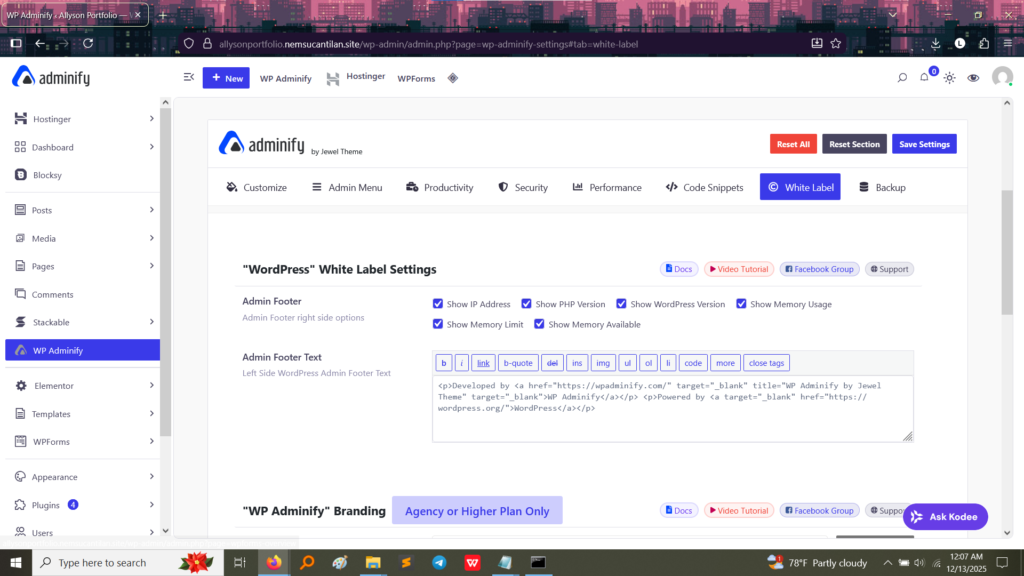 • Proof of Customization: In the “Admin Footer Text” section, the default message has been replaced with custom code.