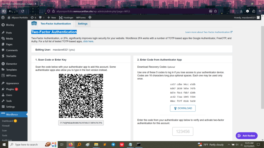 1. Layers of Security: I learned that security is best achieved in layers. WordFence provides a firewall and scanning, and 2FA adds a personal layer of defense at the login screen.