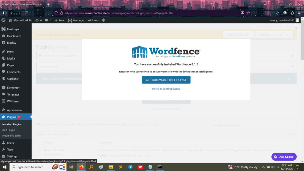 This image confirms that WordFence Version 8.1.3 was successfully installed and activated on the website. This forms the foundation for all subsequent security measures.