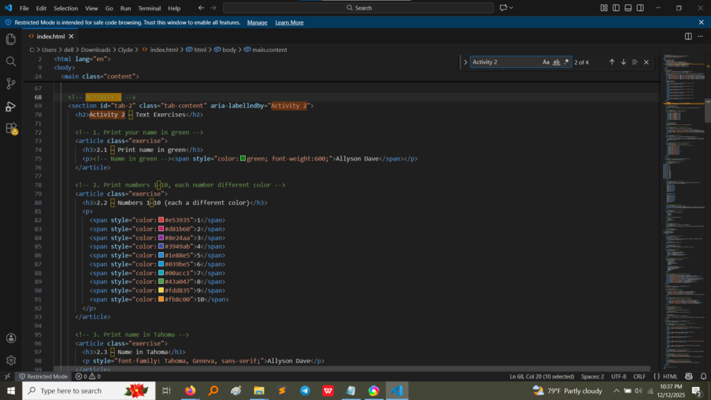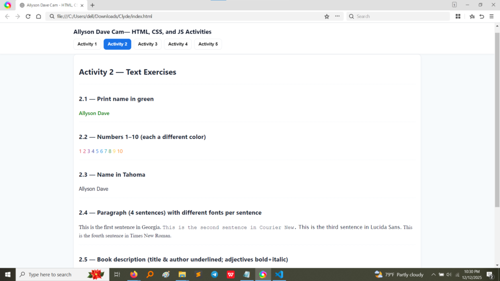 <span> tag. This tag doesn’t do anything by itself, but it acts like a container that allows us to apply a style to just that piece of content.<span> tag, I used the style attribute. For example: <span style="color: green;">My Name</span>. For the numbers, I had to apply a different color code (like #e39351 for orange-red) to ten separate <span> tags! This taught me how powerful and precise inline styling can be.<span> tag was essential here, wrapping around each sentence.font-family. For example: <span style="font-family: 'Courier New', Courier, monospace;">This is the second sentence.</span>. This demonstrated how to control typography and use system fonts like Georgia, Courier New, Lucida Sans, and Times New Roman.<u> tag for the title and author.<strong> tag for important adjectives (“magical,” “poignant,” “thought-provoking”).<i> tag for the word “tale.”<strong> is for importance (strong emphasis), while <b> is for just visual boldness (basic bold).This activity moved us from simple structure to actual design and presentation. The main lessons were: