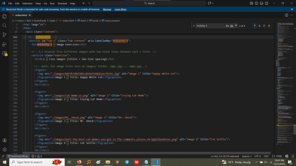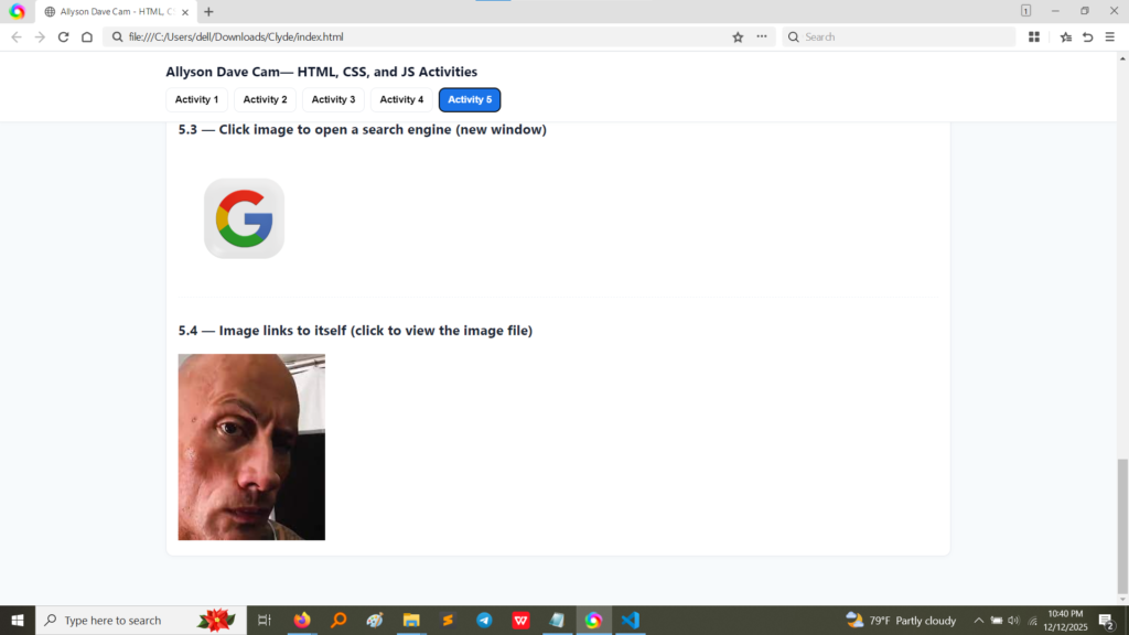 A webpage full of just text can be boring! Activity 5 taught us how to introduce visual interest by adding images. We learned the essential <img> tag, how to control image size, add borders, and, most importantly, how to turn an image into a link that takes a user somewhere else.