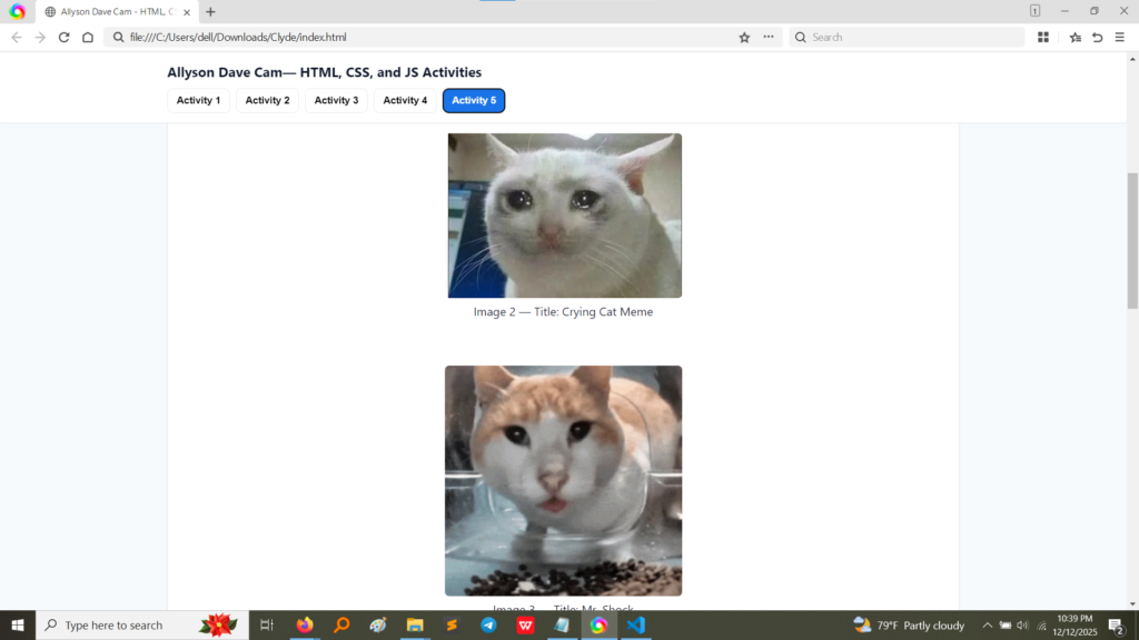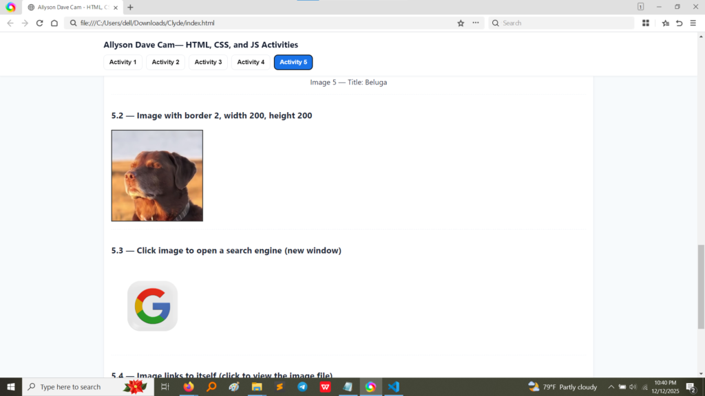 <img> Tag: This is the core tag. It’s a “self-closing” tag, meaning it doesn’t need a closing </img>.src Attribute: This is the most vital part! It stands for source and tells the browser exactly where the image file is located (e.g., images/img1.jpg).alt Attribute: This is absolutely essential! It stands for alternate text. This text is displayed if the image fails to load, and, more importantly, it is read aloud by screen readers for users who are visually impaired. It’s crucial for accessibility.<figure> and <figcaption> Tags: I wrapped each image in these tags. This is the correct way to add a picture with a descriptive title (the figcaption). This structure keeps the image and its title formally connected.width and height Attributes: I explicitly set the size using width="200" and height="200". This ensures the image loads exactly the size I want, preventing strange layout shifts.style Attribute: I used inline CSS (style="border: 2px solid red;") to give the image a 2-pixel red border. This exercise showed me that images can be easily styled just like text elements.<img> tag inside an <a> tag.HTML<a href="https://www.google.com" target="_blank" rel="noopener"> <img src="..." alt="Google logo"> </a> Since the <img> tag is the content of the link, clicking anywhere on the image performs the link's action. This is how almost every button and icon on the web works